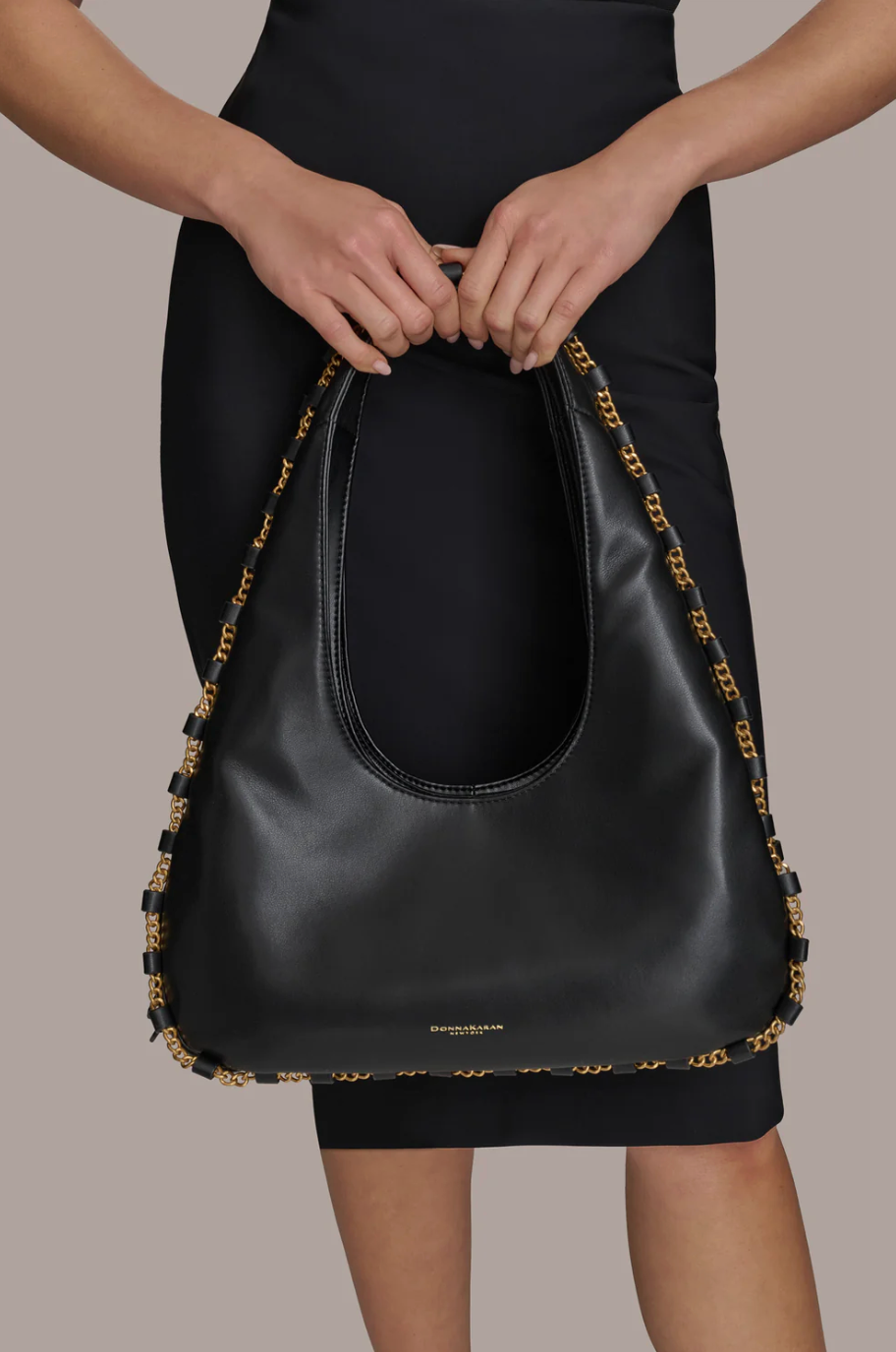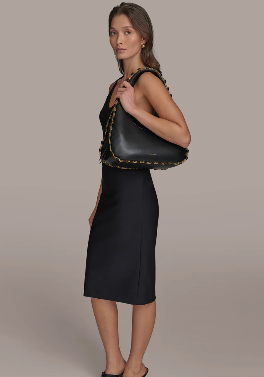 Bolso de hombro de piel con un tamaño ideal para el día a día. Su diseño destaca por los detalles de herrajes tipo cadena con acabado pulido, que aportan un toque moderno y elegante. En su interior cuenta con una organización práctica de tres compartimentos, perfecta para mantener tus esenciales ordenados con estilo. Un bolso funcional y sofisticado que eleva cualquier look.