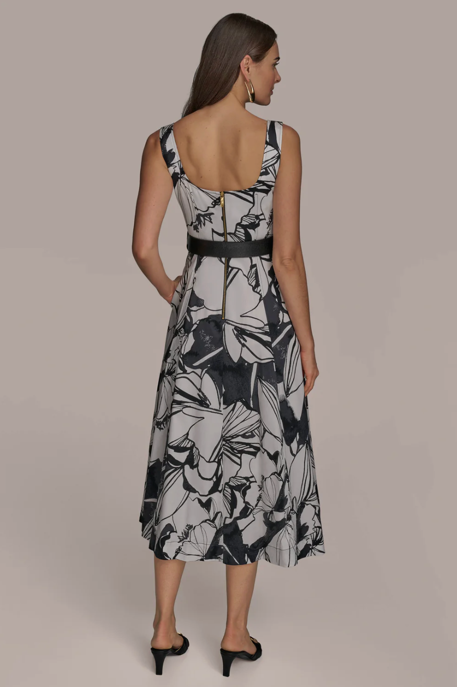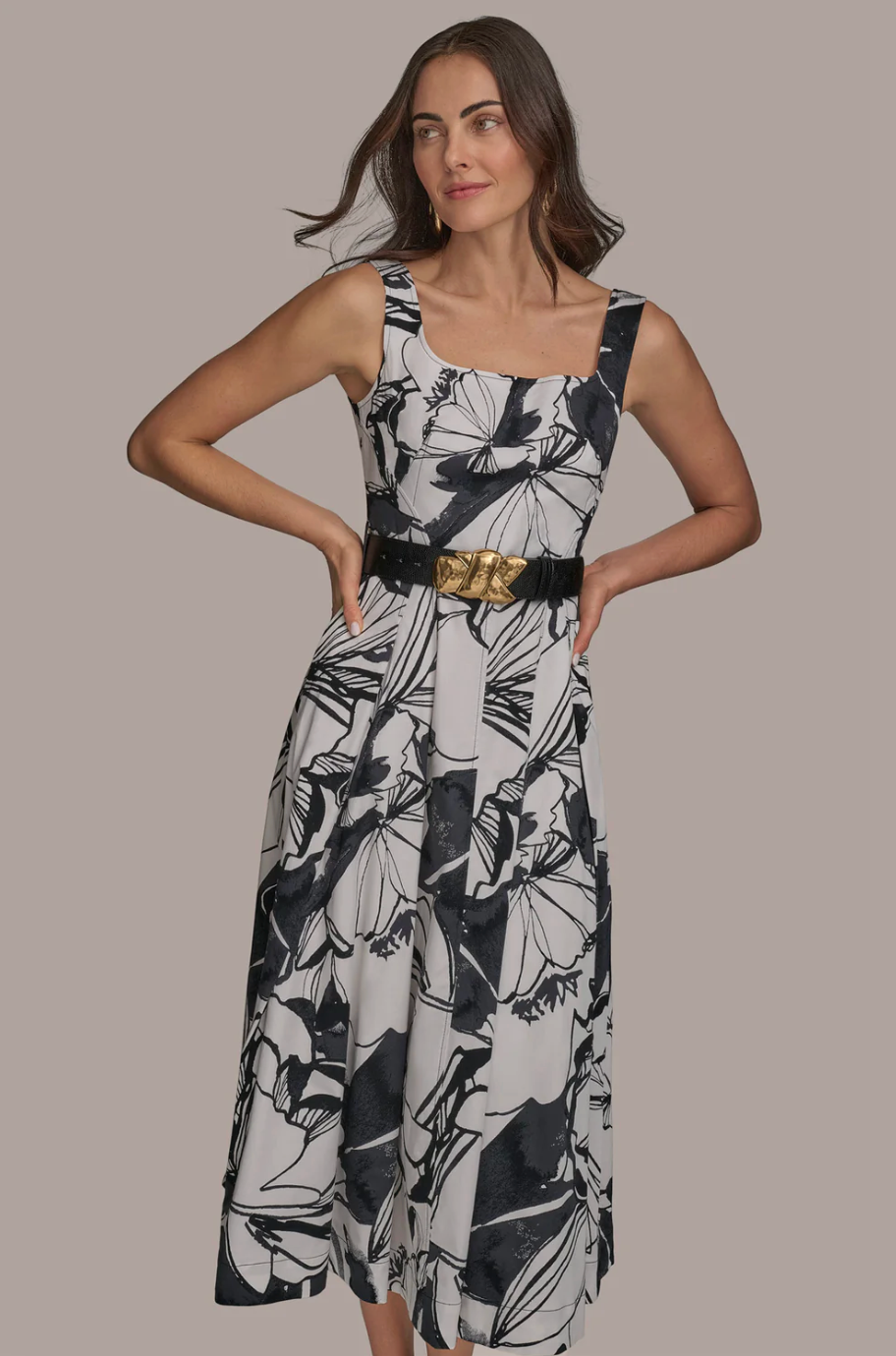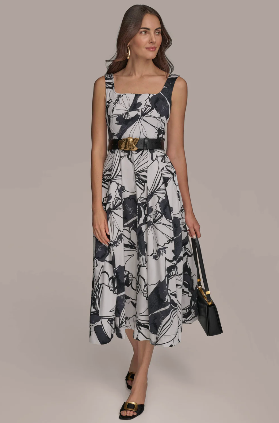 Vestido midi con estampado floral y silueta en línea A, confeccionado en algodón satinado ligero que aporta frescura y movimiento. Su falda fluida con bolsillos añade un toque práctico, mientras el cinturón pulido define la cintura y aporta un sutil brillo. Un vestido clásico con un aire moderno, ideal para ocasiones especiales o looks elegantes de día.