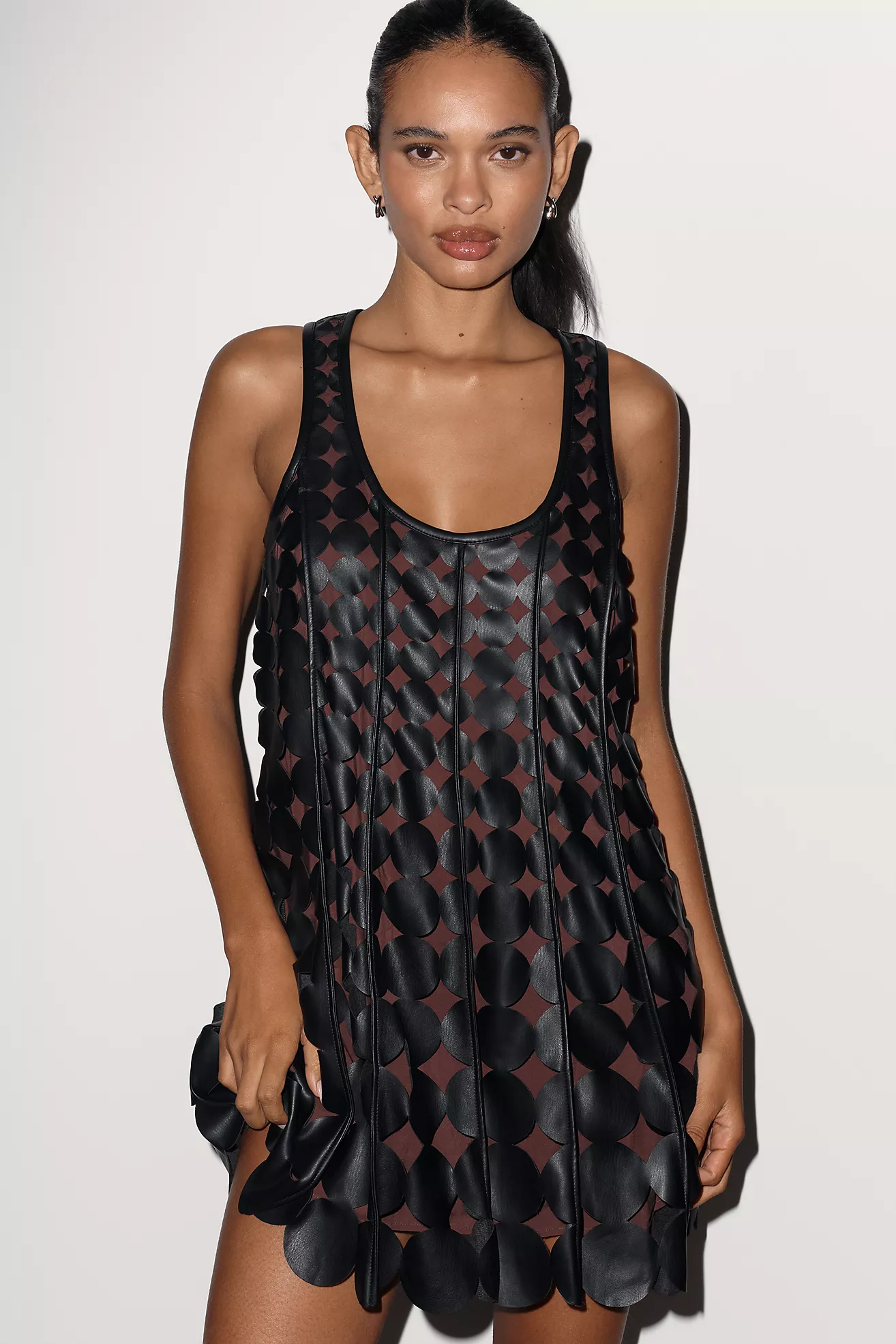 Vestido sin mangas con acabado efecto piel y silueta tipo swing que aporta movimiento y un look moderno. Su diseño limpio y estructurado lo convierte en una pieza fácil de llevar, ideal para crear outfits llamativos sin esfuerzo. Cuenta con cierre con cremallera y un corte favorecedor que funciona tanto para el día como para la noche. Un vestido versátil de Maeve, pensado para destacar con estilo y actitud.